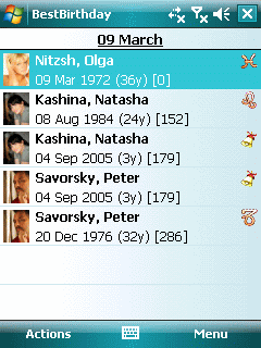 Best Birthday - это программа, которая поможет организовать просмотр дней рождений ваших знакомых. Она позволяет отсортировать дни рождения по месяцу, знаку зодиака и отфильтровать их. Также есть удобная функция отправки поздравительных сообщений. Работает как на КПК, так и на смартфонах под управлением Windows Mobile