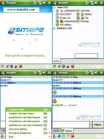 Sm@peR - это лучший ICQ-клиент для смартфонов, работающих под управлением операционной системы Windows Mobile, имеющий эргономичный и интуитивно понятный интерфейс и высокую функциональность.