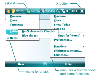 Эта программа полностью имитирует панель задач Windows на карманном компьютере пользователя, если его мобильное устройство работает на ОС Windows Mobile 5/6. Пользователь может быстро переключаться между задачами, выбирая нужную на панели задач, причем можно переключать задачи как стилусом, так и с клавиатуры устройства. Темы для WkTASK исполнены в цветовой гамме старых версий Windows, что усиливает общий эффект от программы. Приятно отметить, что программа не требовательна к ресурсам процессора и оперативной памяти. Позволяет минимизировать/закрывать проги по крестику, добавлять их в исключения. Показывает запущенные проги в верхнем баре. Встроенный лаунчер позволяет добавить до 12 ярлыков(прог) Дополнительные функции: отключение экрана, поворот экрана, перезагрузка, включение/отключения gprs-коннекта. Есть управление подсветкой и громкостью. Что нового: v. 1.2.0.1 от 11-12-2008 - Исправлено ошибка запуска программы после добавления приложений в лончер (на некоторых девайсах). Системные требования: WM2003 - WM6 Дополнительные требования: Нет данных Разрешение экрана: Все разрешения Тип установки: CAB Автор/Разработчик: Wk Software Lab (Japanese) ![]() ![]() ![]() ![]() Скины: ![]() WKTask1201 |
