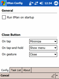 ![]() Возможности: - Очень маленький размер - Закрытие приложений одним нажатием - Закрытие и сворачивание - Кнопка перезагрузки в меню - Кнопка отключения экрана в меню - Кнопка выключения в меню - Кнопка поворота экрана в меню - Установка приложения на кнопку - Убивание процессов моментально - Настройка цветов менеджера - Лист игнорируемых приложений - Настройка кнопки закрытия/сворачивания для отдельных приложений Обновления: -Fixed one icon offest problem -Added Alt+Tab feature (short press to switch aplication, long press to open task list menu) Системные требования: PocketPC 2003/SE, Windows Mobile 5.0 for Pocket PC, Windows Mobile 6.0 Professional; 200 MHz processor (ARM based). 16 MB RAM. Руссификатор в комплекте. Скачать: TMan |