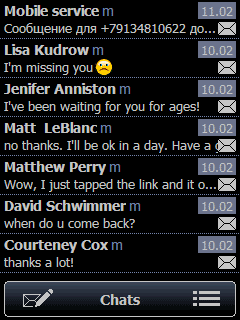 Приложение SMS-Chat выпущено для сайта IWindowsMobile. Название сайта недвузначно намекает, что данный программный продукт будет работать только на устройствах с операционной системой от компании Microsoft, а в частности Windows Mobile 5.0/6.0. Описывать, что делает приложение, не имеет смысла, так как его назначение понятно из названия. Зато стоит отметить, что разработчику удалось создать удобный и красивый анимированный интерфейс, что в комплексе с поддержкой управления пальцами понравится многим. В дополнение к этому присутствуют такие функции как массовая рассылка SMS, перенаправление SMS, групповое удаление SMS, а также поиск.