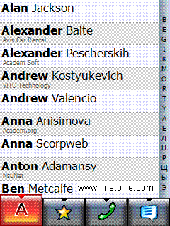 Программа FunContact представляет собой менеджер контактов. Главная изюминка в интерфейсе, ориентированным на управление пальцами. Список контактов можно легко прокручивать одним движением пальца. Анимированные меню и другие элементы интерфейса достаточно крупные для попадания пальцем. Поддерживается сортировка списка по имени, фамилии или компании. Предоставляется быстрый доступ у избранным контактам и истории звонков.