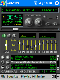 WithMP3 - этот плеер воспроизводит музыку в форматах MP1, MP2 и MP3, а также обладает 10-полосным эквалайзером и редактором плэй-листов. Также WithMP3 способен отключать экран во время воспроизведения (для экономии батарей) и имеет анализатор спектра звука для обоих каналов