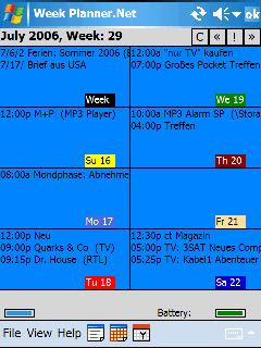 Week Planner позволяет кратко отображать всю неделю на экране КПК. Все данные берутся из календаря Mobile Outlook.
